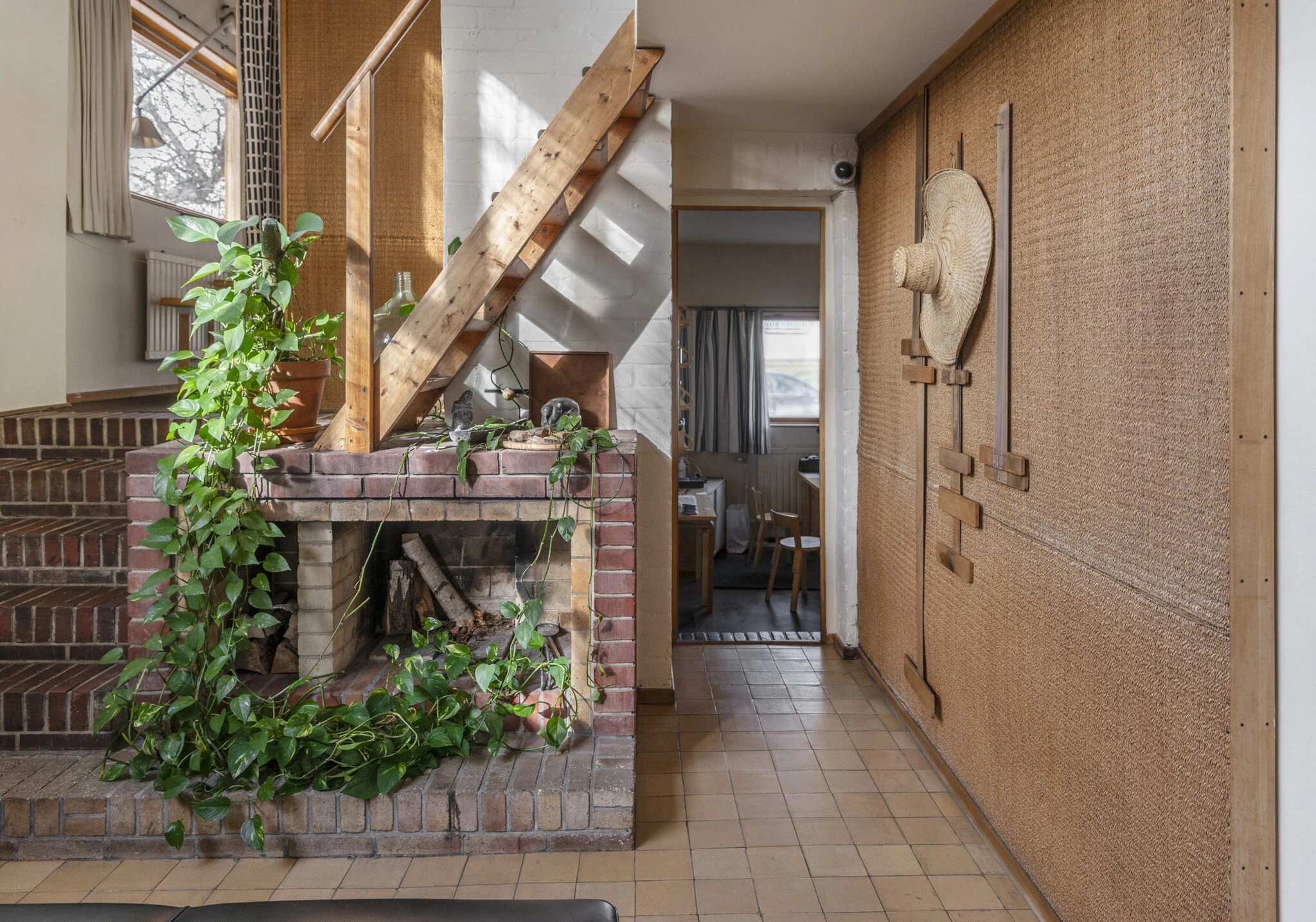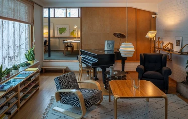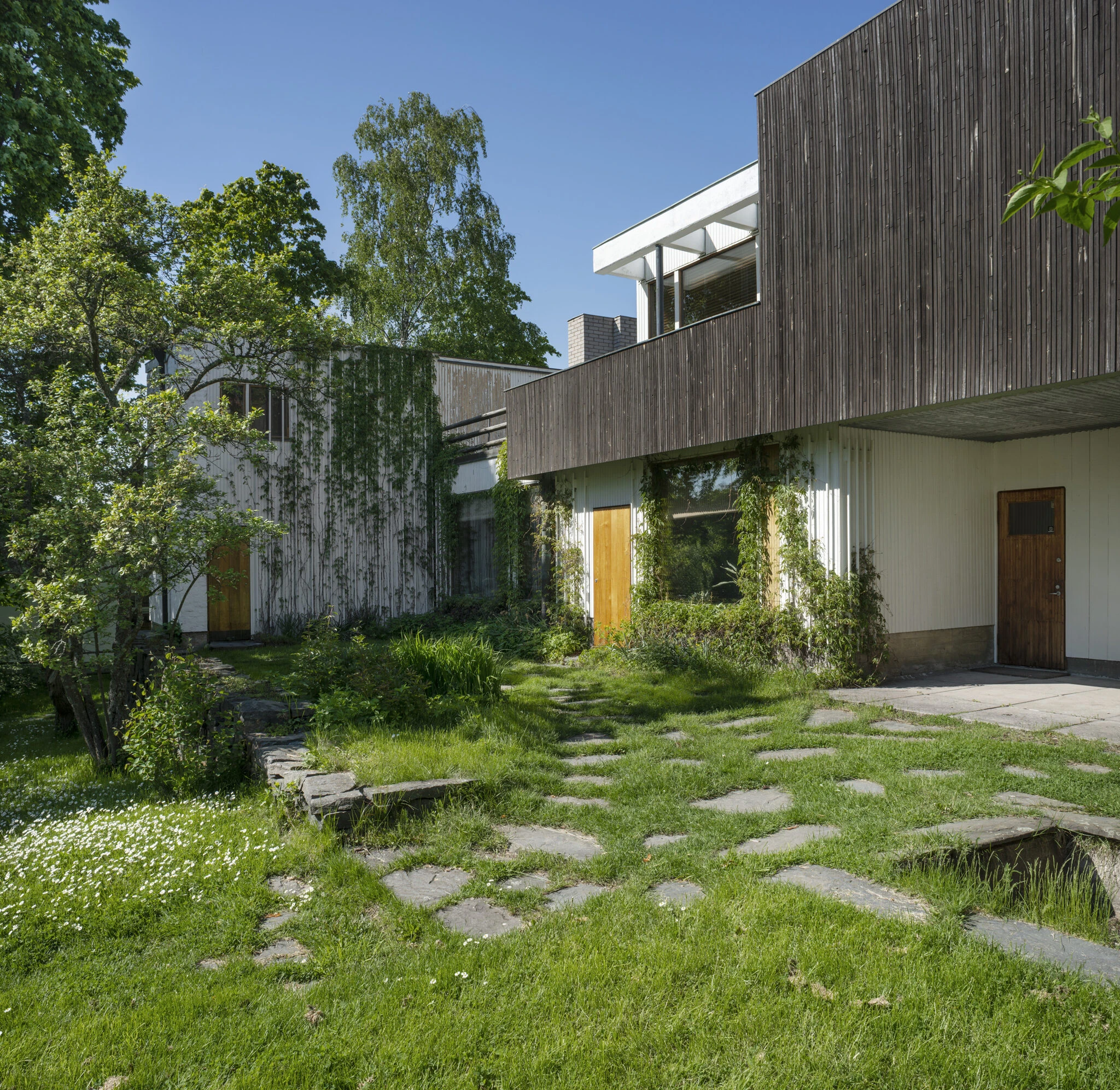 1934年、アイノとアルヴァ・アアルトは、ほぼ⼿つかずの環境にあったムンッキニエミ地区のリーヒティエ通りに敷地を購⼊し、⾃邸の設計を始めました。アアルト夫妻の住まいとアトリエを兼ねた建物は、1936年に完成しました。アアルト夫妻が設計したこの建物は、⾃然素材をふんだんに⽤いることで近代建築の芸術様式を和らげています。⾃邸の設計だからこそ、様々な構造や建築材料の実験ができました。